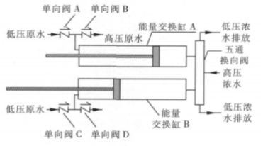 低壓原水從單向閥 A 或單向閥 C 進(jìn)入能量回收裝置,充滿能量交換缸 A 或 能量交換缸 B;高壓濃水從五通換向閥進(jìn)入能量回收裝置,當(dāng)五通換向閥使高 壓濃水與能量交換缸 A 連通時(shí),高壓濃水將能量傳遞給低壓原水,實(shí)現(xiàn)能量交 換,高壓原水從單向閥 B 進(jìn)入反滲透膜壓力容器進(jìn)行脫鹽處理;待將能量交換 缸 A 中的原水全部加壓送至反滲透系統(tǒng)后,五通換向閥,將高壓濃水與能量交 換缸 B 連通,重復(fù)上述能量交換過程,同時(shí)能量交換缸 A 中低壓原水進(jìn)入,排 出低壓濃水。兩個能量交換缸交替進(jìn)行高壓濃水與低壓原水的能量交換,實(shí)現(xiàn) 將低壓原水連續(xù)增壓送至反滲透系統(tǒng)進(jìn)行脫鹽處理。